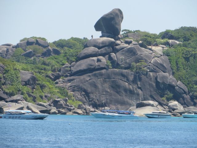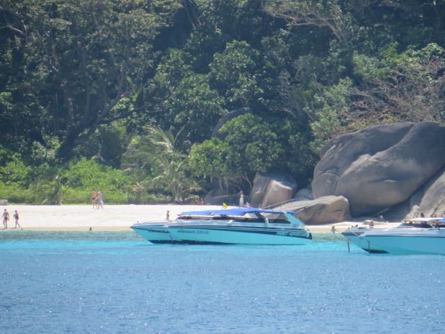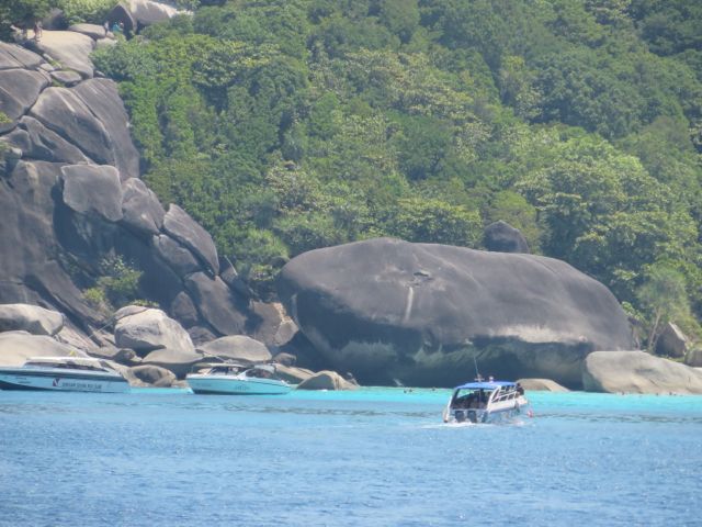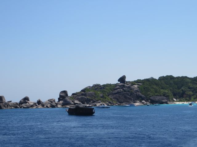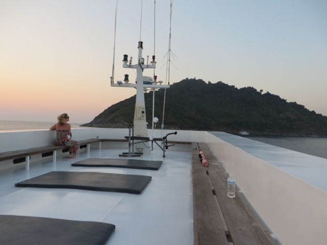 I’m a beach girl. And I love to sail. Southern Thailand is all about the beauty of the sand and the water, and I was on my way to see some of the most beautiful Thai beaches and diving sites aboard the White Manta, a 120-foot motor yacht hosting 24 divers on a 5-day live-aboard tour of the Similan Islands in the Andaman Sea. Woo hoooo!! Flew from Bangkok to Phuket, was picked up at the airport by the White Manna crew, and drove to Koh Tao to board this great vessel. She is huge – 24 divers and a crew of 19, you never once felt crowded! My roomie was (is!) awesome – Jo from Bath, England – we were laughing right away and sharing middle-of-the-night snacks and chats from day one. I was the only snorkeler – this was a serious dive boat, and with 4 dives per day, no one had the energy to snorkel in between dives – so I went out everyday on my own but with one of the guys that drove the dingy to chaperone so I was never really alone. Having snorkeled the Great Barrier Reef, I have to say this wasn’t as brilliant, but I did get the biggest joy ever seeing the GIANT MANTA RAY swim just beneath me! I just held my heart – tried not to hold my breath – as he swam so elegantly and majestically by. Enormous!! Wow!! I really didn’t need to see anything after that. Although, all my mates saw Whale Sharks and I didn’t. No complaints, loved it all. By the way, the food was AWESOME on this boat!! I think the best Thai I had in Thailand!!