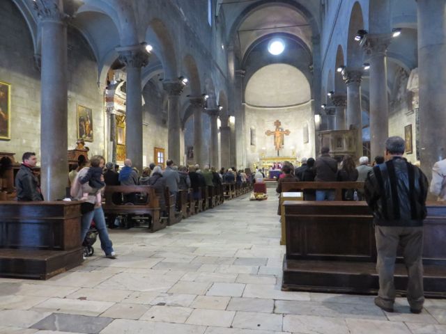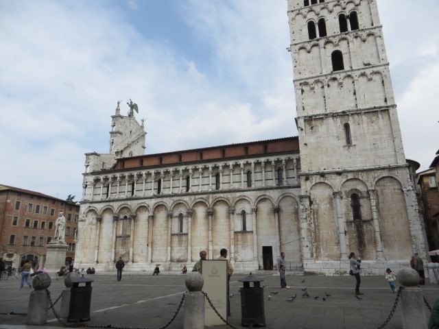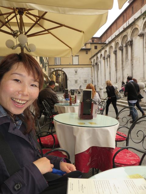 On Saturday, Miyuki and I decided to take the train to Lucca, about an hour and a half west of Florence near the Tyrrhenian Sea. Lucca is a picturesque, beautiful Tuscan city that is famous for its Rennaissance-era walls that surround it. These walls are so wide that cars can actually drive on them, but these days they are used for strolling, biking, jogging, and just hanging out. It’s like an elevated garden and track that surrounds this small city. Lucca is also the birthplace of the great composer Puccini (Madame Butterfly and La Boheme). Getting there is very easy, one fast train which lets you off just outside the walls. And the city is so small that you can walk the whole thing in a day. So off we went!