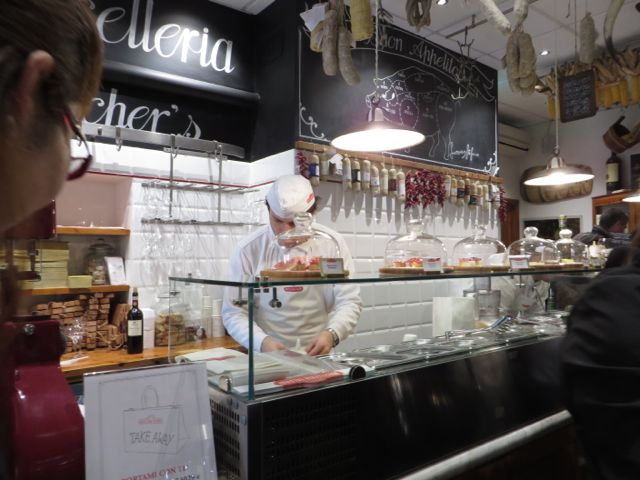 The next meal of the day, lunch – pranzo – is the most important one here. It’s why all the shops close for 3 hours each and every day without fail. They could care less if you are shopping – they’ll throw you out at 12:30 and tell you to return at 3:30 – and if they lose the sale, whatever. Trattorias all serve some form of what we know as a ham and cheese sandwich. Proscuitto, Brasaola, Speck or Salami are the main meats, and Pecorino or Mozzerella are the main cheeses for this “panino” which is usually made on a thin Italian bread called schiacciata, which is like a thin foccacia. It’s delicious, but usually needs some olive oil and salt drizzled on it if eaten alone. The thing about Florentine bread is that it is made without salt – something that started back in the Middle Ages when salt was heavily taxed, but continued due to Florentine pride. Dante wrote about it, so we know it goes wayyyy back and was notable! Many of Tuscany’s foods are already heavily seasoned so unsalted bread is actually a better compliment! For those who want to dine, there are always soups – Pasta Faggiole, of course, or Ribolitta which is a Tuscan bread and vegetable soup made with day-old bread. Yum! Florentines are famous for their “Bistecca” – a thick cut of T-bone steak, perfectly seasoned, crispy on the outside, and rare on the inside. Just like Peter Lugar’s, but maybe less butter? And as far as pasta goes…..I could cry from joy each and every time I eat it, which is practically every day. I’ve never had perfect pasta until I came here. We Americans overcook everything! My favorite is probably Pappardelle with Duck Ragu from Il Santo Bevitore. Or maybe Spaghetti Arrabiata from Trattoria del Carmine. Although the ravioli at La Giostra was unreal…do I really have to choose?