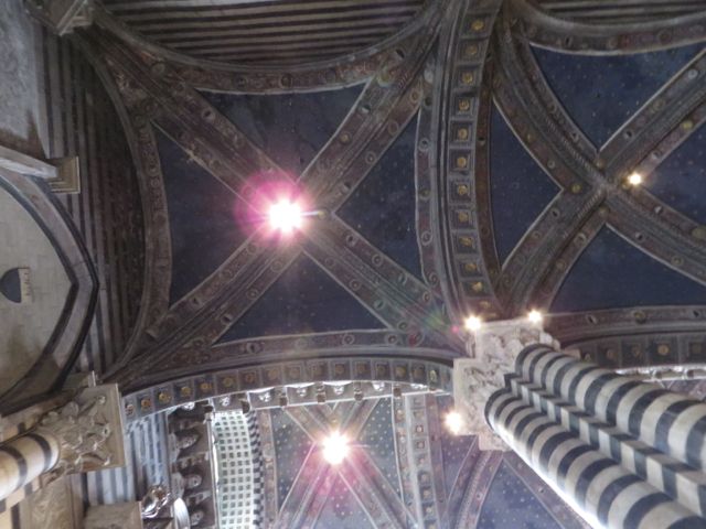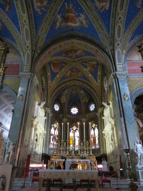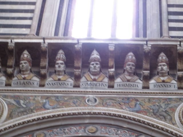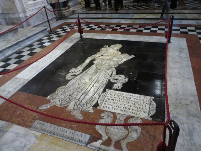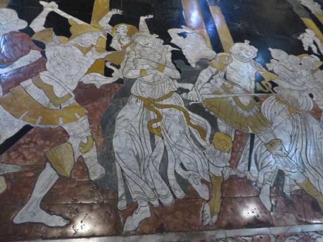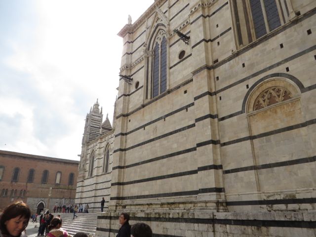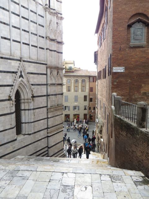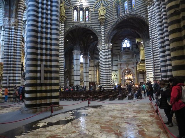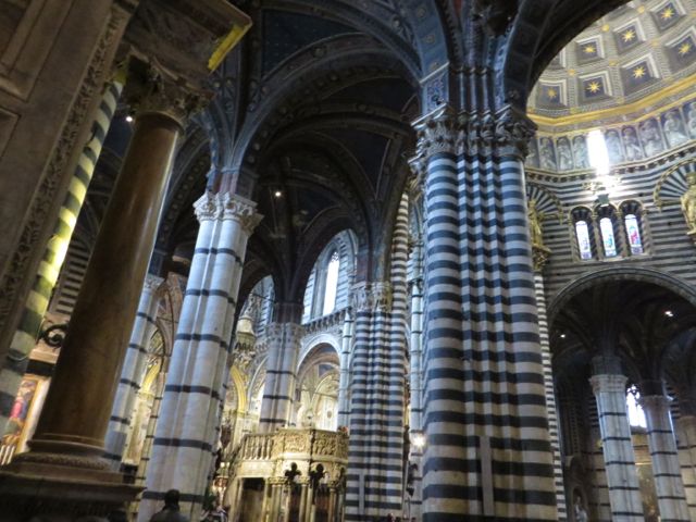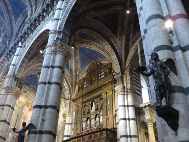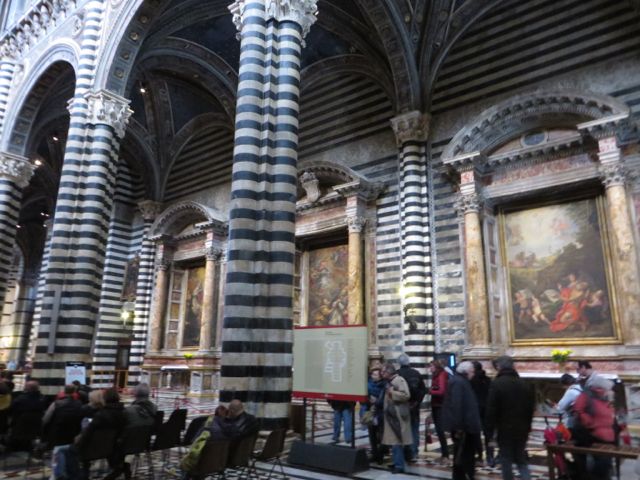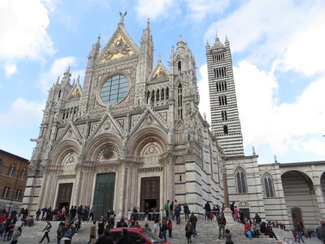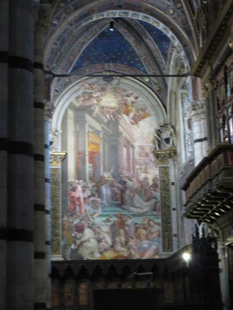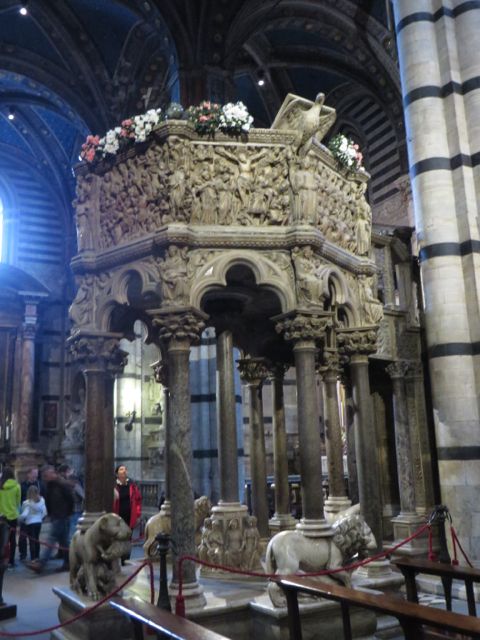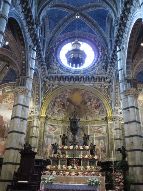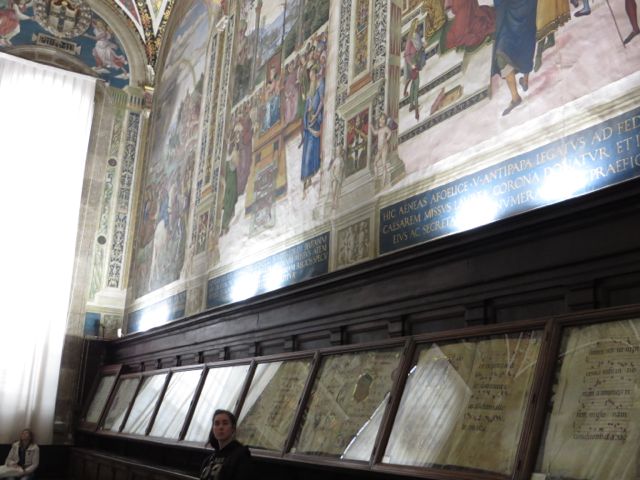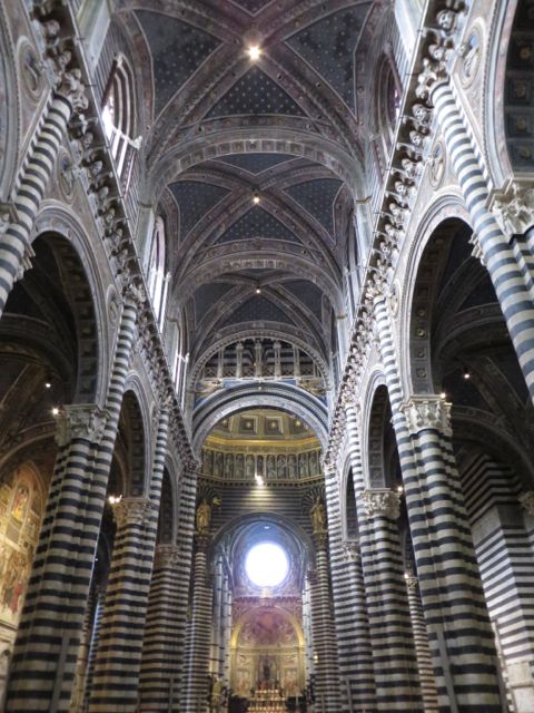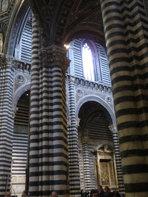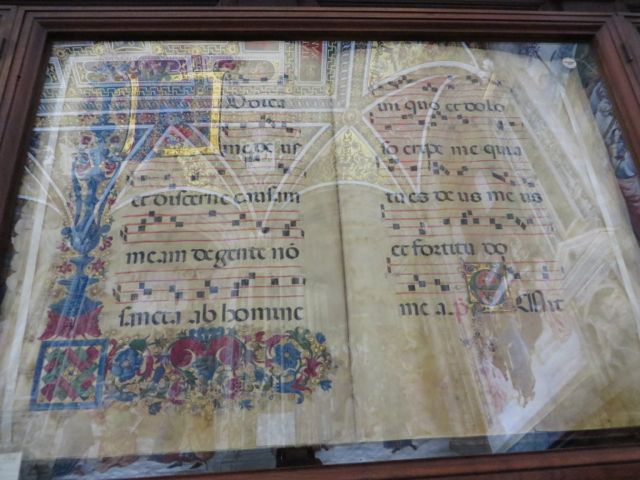 Next destination was Siena. I had been through Tuscany before, but never made it down to Siena, so I was anxious to see what I had heard is Tuscany’s loveliest medieval city. And rumors turned out to be true. Siena is a beautiful, steep city that sits on 3 hills. The central Piazza, known as the Piazza del Campo, is where the famous Palio horse race is run twice every summer. We climbed the hills and walked the twisty streets, stopped for some gelato at Grom (chocolate noir – to die for), and made our way to Siena’s Duomo. This cathedral, built in 1215, was the highlight of Siena for me. I loved the gothic details, the banded black and white marble, and the floor panels which are inlaid marble mosaic “paintings” done by the leading artists from 1369 -1547. The cathedral also has Donatello’s St. John the Baptiste, as well as many other major sculptures and works of art. The Piccolomini Library houses these ancient books and it is so fascinating to see the writing in these books, all done by hand of course, but perfection! Have a look.