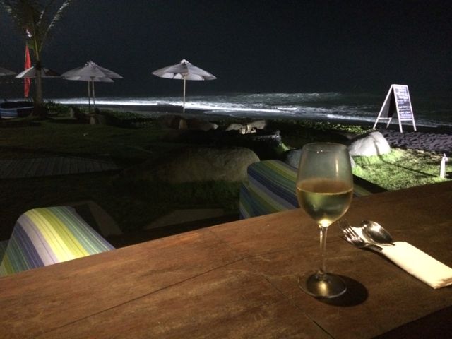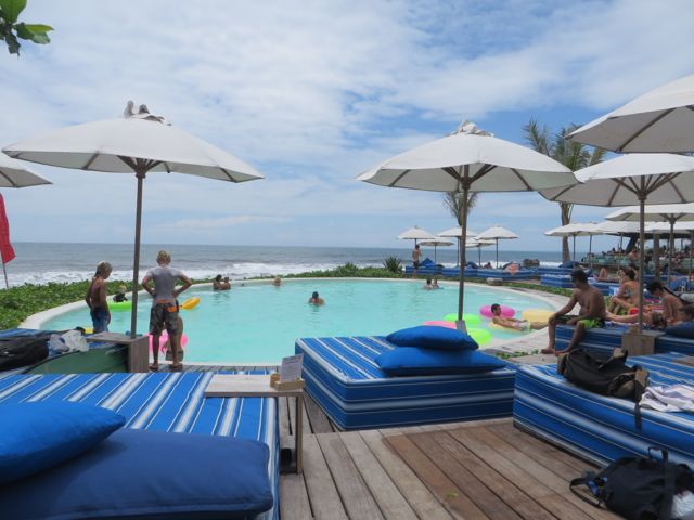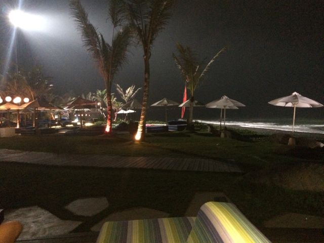 Did I say I wasn’t a resort person? Well…obviously I can be swayed…just has to be the right resort!! After leaving Villa Puri Purnama I booked 2 nights at the totally cool Komune Beach Resort on the famous Keramas beach, a surfer’s paradise. It was 5 minutes from the Villa, but it could easily have been in Miami. The design of this resort is a totally laid back, cool vibe on a gorgeous property, lush with winding paths, pool beds to lounge on all day, an awesome bar/restaurant for all meals, snacks or drinks, and even an outdoor screening area where they show movies at night. By day I was happy lounging at the pool, and by night I was equally happy to sit at the bar facing the ocean and watch some night surfing – there is a huge floodlight that lights up the ocean.