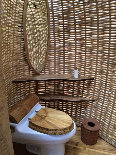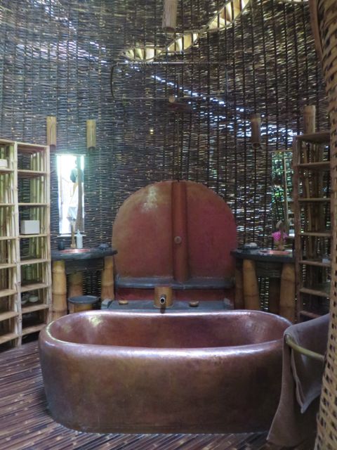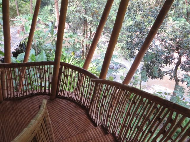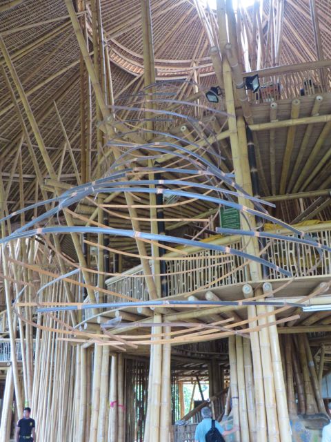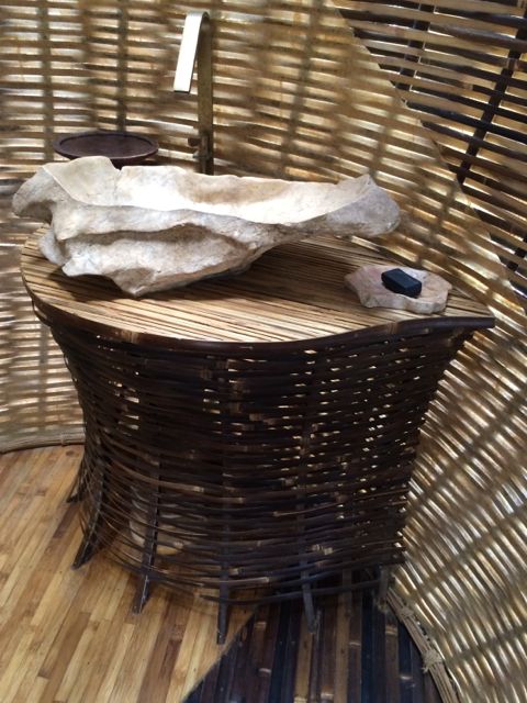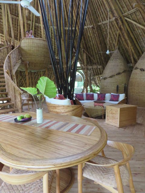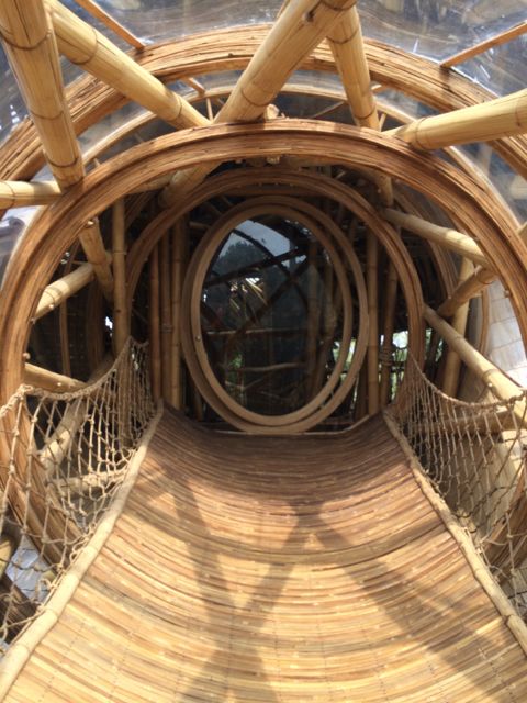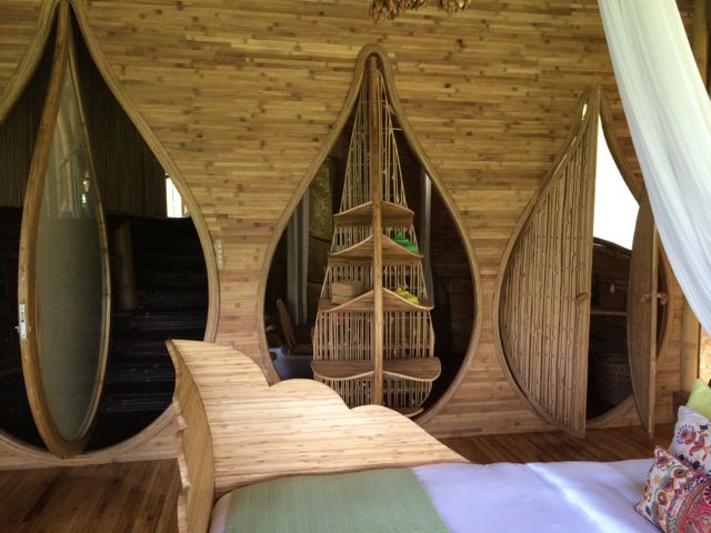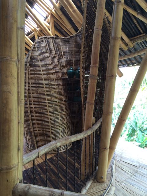 Following Green School, John, Cynthia and daughter Elora with her firm Ibuku began developing and building an entirely green community, called Green Village. Set on the Ayung River just a short drive from Green School, Green Village has risen out of the tropical landscape as an off-the-charts luxury collection of homes. It is a living, breathing brought-to-life dream, part Dr. Seuss, part Alice-in-Wonderland, and part Jetsons. And I say this only with the sincere and deepest appreciation for the fantastical imagery that their creators conjured up. The architecture follows the Bali vernacular of open-air living, while taking it to new heights, literally. The latest home is 9 levels and 8,000 SF. From the outside, it looks like oblong disks precariously stacked on top of each other by a toddler. The house is called Sharma Springs, aptly named after its Indian owners and the fresh water springs it sits on. The entrance to this house is a circular bamboo and plexiglass tunnel supporting a footbridge that leads to a circular door, hinged top and bottom that pivots open on its axis inviting and coaxing visitors inside. And then the jaw-dropping really begins. The bamboo takes on a life of its own, from supporting structures, to whirling ceilings, to winding staircases, to all sorts of furniture, romantic and playful beds, secret shelving walls that pivot to expose another room, and beyond. The balusters are slices of bamboo cut lengthwise that reveal the hollow interior shaft, called internodes, and the solid nodes. These slices alone are works of art. The bamboo flooring shows at least 6 different ways to “slice” it, whether it be on its thin side, flat side, woven and patterned, natural black bamboo or the lighter pale color, or a combination of both. While I was walking through, Rudiger Schodel was installing wire strings on a set of structural bamboo poles and creating a musical instrument. He has created this “instrument” which is so fascinating, whimsical and playful, and he hopes to inspire people with little or no musical training to give it a whirl. The sound that emanates from it is truly beautiful, and he tunes the strings with exact precision. He played for me, and then encouraged me to try while he played a wood flute and we made….well, music! For more on Rudiger, www.klangkunstwerk.ch. This house is truly a conglomeration of many artists, engineers, and creative geniuses, and has been most inspirational to me as I continue to explore my own boundary-less future.