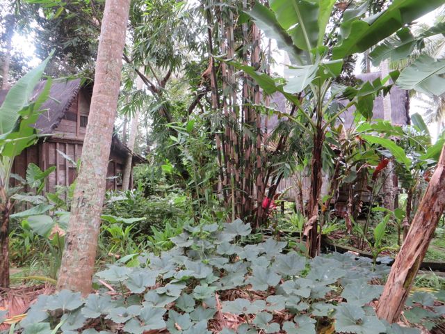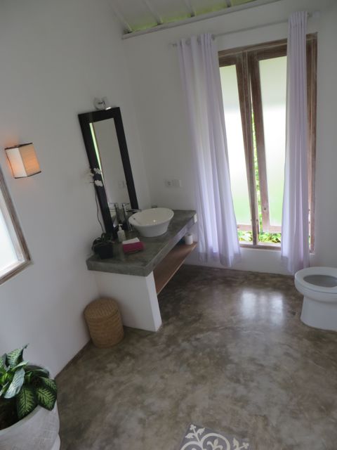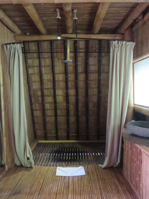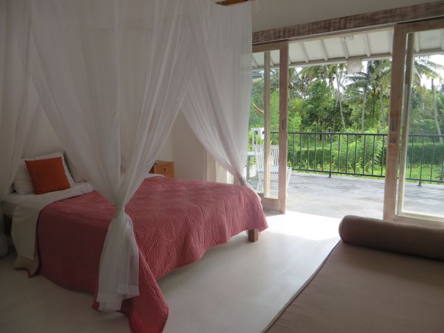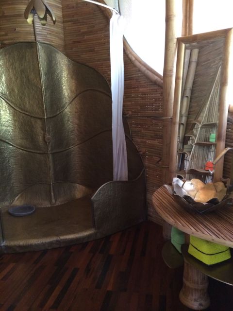 As I followed the maze of this house, the obvious question became apparent. What does it feel like to live here? Lucky for me, I spent the night in the guest house of Sharma Springs to experience all that I could. The guest house is a small one-bedroom but it still delighted my senses and fed my curiosity. The house does have modern conveniences, such as a mini fridge and a/c, although the a/c wasn’t working well – the ceiling heights are so high that I think the colder air just gets lost up there somehow. There are no ceiling fans and it was a hot night, so I didn’t sleep well. Still, I enjoyed my home-grown Balinese dinner out on the porch, I showered under the huge rain-can and watched the water go through the open floor boards and hit the ground below, and luxuriated in my gorgeous bed’s fine linens while the lullaby of the jungle serenaded me. I felt whimsical, adventurous, luxurious, and satisfied that I had partaken somewhat in sustainability.