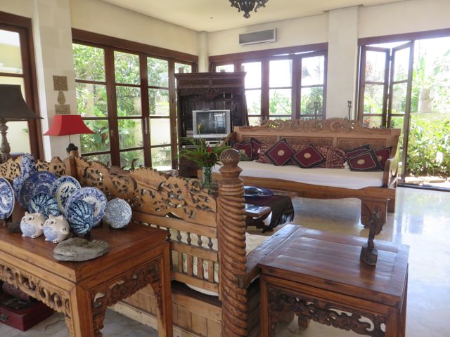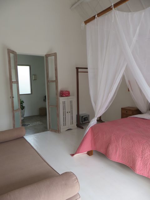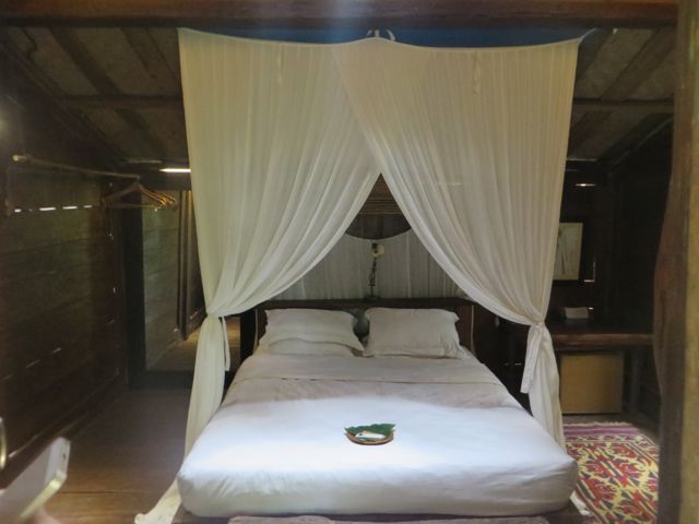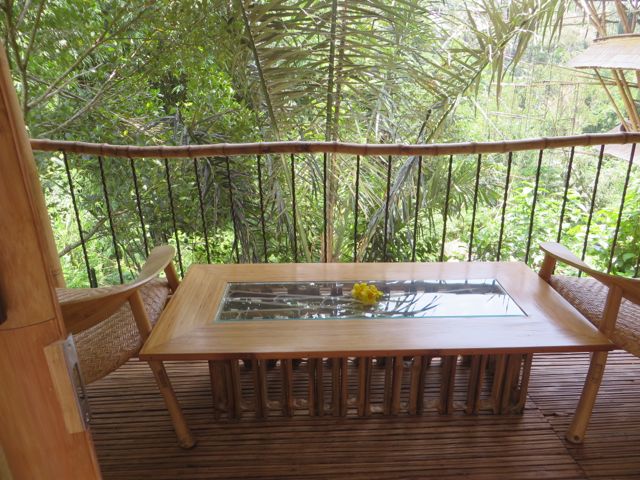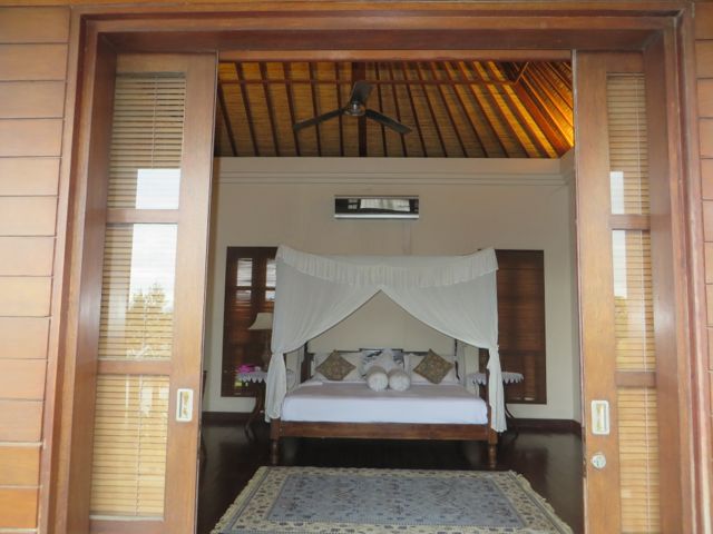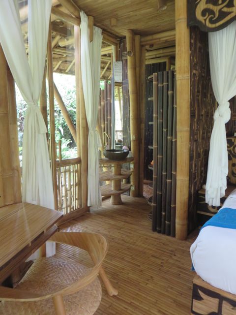 My next destination was to John & Cynthia Hardy’s boutique hotel, Bambu Indah. The property is home to the Hardy’s and was originally developed for their family and friends to stay when they were visiting with them in Bali. John & Cynthia purchased 11 antique Javanese wedding houses in Java and had them carefully dismantled and shipped to Bali where they were lovingly re-assembled at what is now called Bambu Indah. Each house is named and has a story. I stayed in Biru house, which means “blue” and enjoyed a rustic, natural setting, astonished that these truly old homes – over 100 years – have stood the test of time and continue to give joy to those lucky enough to be sheltered by them. The floorboards in my bathroom were thin and spread far apart from wear, and I watched the water from my shower drain down to the ground beneath the house, nourishing the soil. The lighting in these houses is done beautifully, highlighting the worn wood and detail. The floors creak loudly and are gorgeous – I wish I knew what type of wood they were. And yes…the a/c above my head worked beautifully!