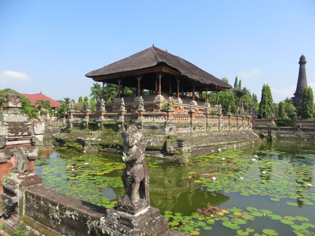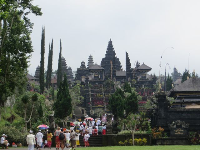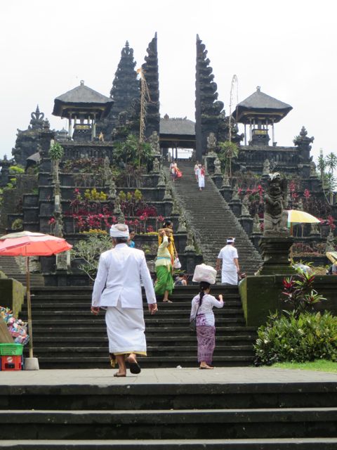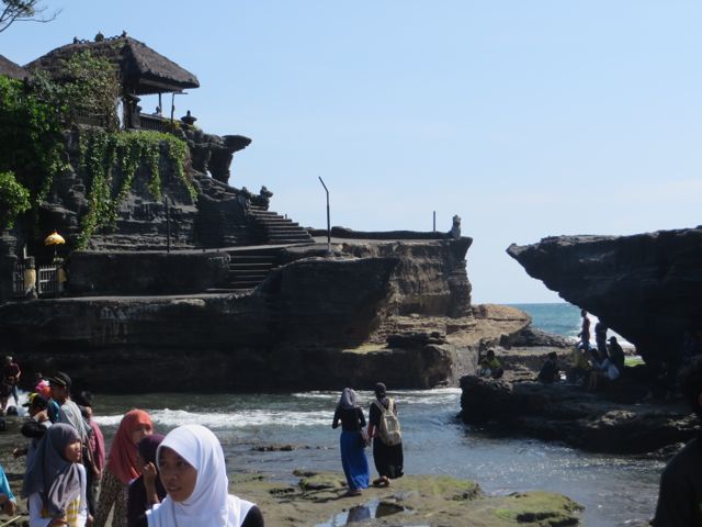 So I can’t say I did much here for my 6 days other than turn my body from one side to the other to toast evenly. And dip into the 86 degree pool every hour to try to cool down a bit. Paula and her husband had left for a 5-day trip to Java, so I was on my own except for the Chinese family. I did hire a driver to take me to see Tanah Lot – an ancient Balinese Temple built on a cliff over the ocean on the southeast coast of Bali. It was swarming with tourists and tourist shops that you have to walk through in order to get to the temple. Once I reached it, I was surrounded immediately by heaps of Muslim students on a field trip with surveys that they had to complete for school. I agreed to take allow them to ask me the questions – it was a way for them to practice their English. They were really adorable. Honestly there were hundreds of these students so you can imagine how many asked me to be interviewed and the amount I waved off until I finally agreed. So getting an affirmative response from me was like landing the big fish! They all of a sudden got nervous and pulled in their friends to do the talking.