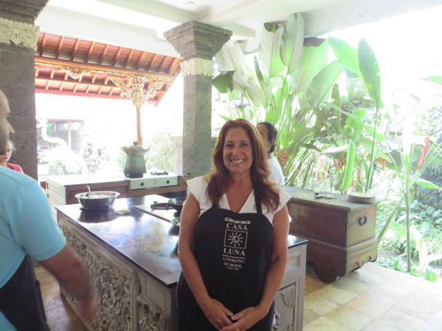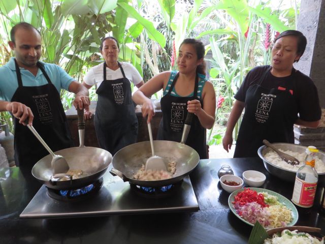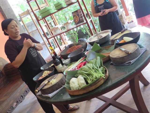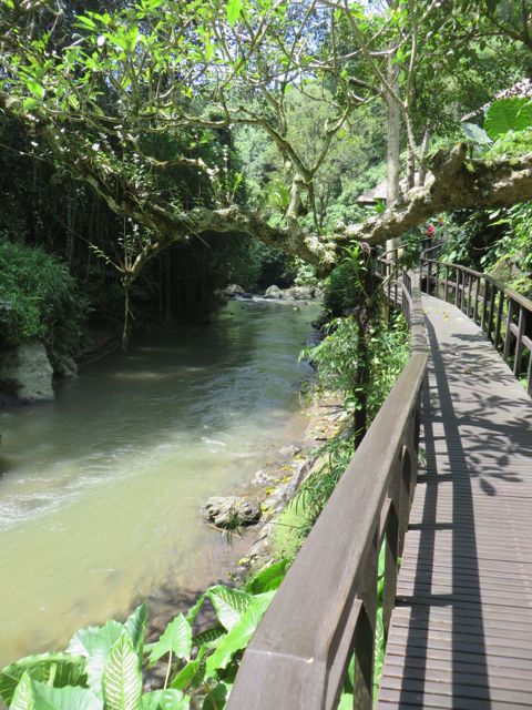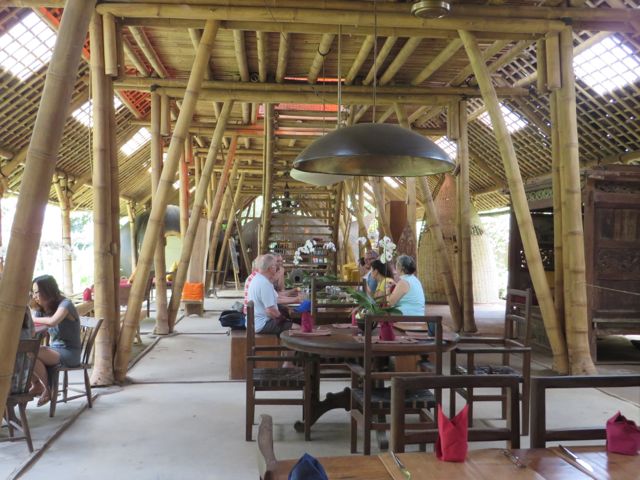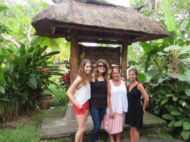 The next two days were spent resting, as you can imagine. White rice and ginger tea for breakfast, lunch and dinner. By Friday I was feeling better and ready to head out again. I had signed up for a Balinese cooking class at Casa Luna, and it was fabulous. We learned about the different herbs, spices, vegetables and fruits that are indigenous to Bali and used in Balinese dishes. We learned to use a flat mortar & pestle to combine ingredients the Balinese way. One woman kept asking if she could substitute things and the answer was always “this is how we do it in Bali”. It was definitely not getting through to her that “the Balinese way” is what we’re here to learn. We made chicken satay, peanut sauce, nasi goreng (Balinese fried rice) vegetarian and with chicken, and a vegetable salad, and then sat down and feasted. Yum!! I walked the streets of Ubud, wandered in and out of shops, bought a pair of earrings from a local jewelry designer, and started to feel like me again. A new pair of earrings can do that. Iris, I know you understand this. On Saturday I did some more wandering with a goal of having lunch at Bebek Bengil, famous for their crispy duck. I wandered in just ahead of 3 young girls who graciously invited me to join them for lunch, and I have to say I was thrilled and aching for my daughter at the same time. But this was pretty close to being with her, as they were all around 23 yrs of age. Daphne from Taiwan, beautiful and smart, works for Uber in Taiwan. Alexia from Cali works for Groupon in Taiwan, and their friend from Pennsylvania (so sorry I’m forgetting her name!) was on hiatus searching for her next job. We really did have a nice chatty time and we hugged goodbye and wished each other safe travels.