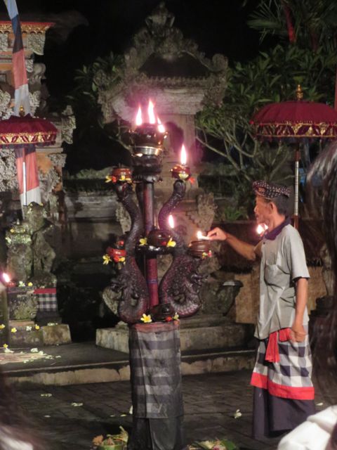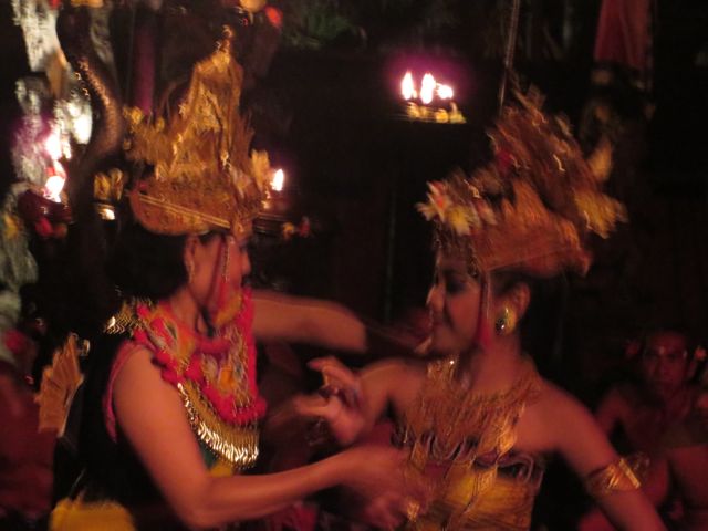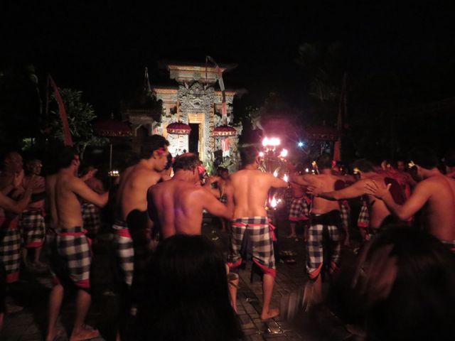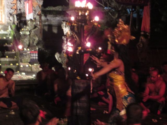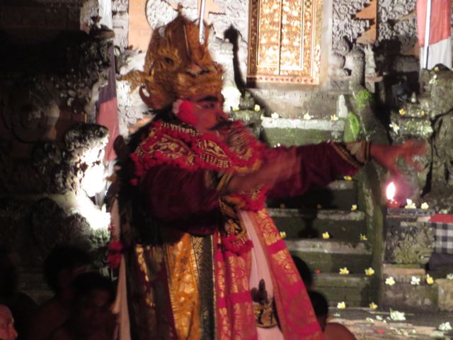 Saturday night I enjoyed a Kacek and fire dance performance at the local village temple. Over 100 men chant the songs that tell the story of the Balinese lovers caught in a jealous triangle. Almost Romeo & Juliette-like. The costumes and makeup are fantastic. I think I smiled for an hour and a half straight through to the end of the show – the finale being a fire walker. Damn, his feet must be numb. Dirty goes without saying.