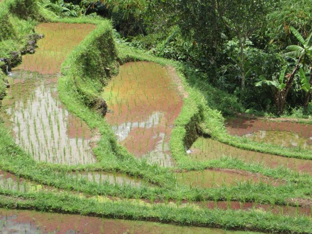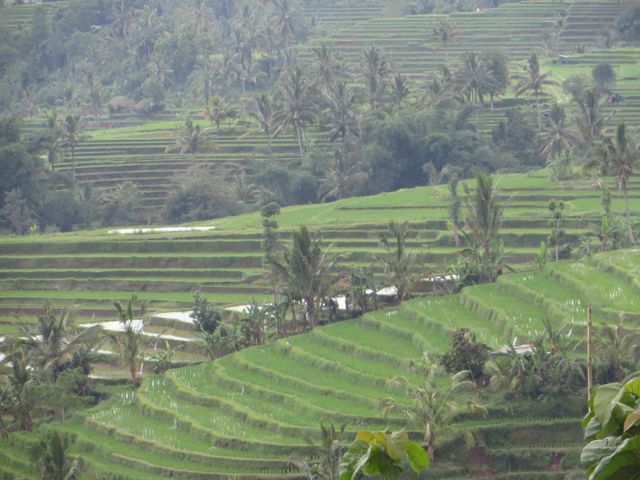 Sunday was the best day!! I had rescheduled a tour of Jatiluwih Rice Fields from the earlier in the week when I was too sick to go, and although I had seen some rice paddies, there ain’t nothing like this!! Tiered, green, waves carved into the mountain sides, cascading down and around making wavy geometric turns. Art Landscape! Rice takes 3 months to grow, so it is harvested 4 times per year – oh you can do the math? Cool. The paddies are flooded in the earlier stages until the green stalks finally sprout and turns a wheat color. The villagers here bathe in the stream, and I was amused by this one adorable little Balinese girl proudly washing her tummy with a bar of soap. When I asked to take her picture, she was indifferent but didn’t want to look at the camera.