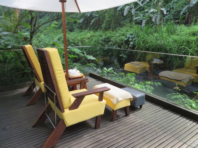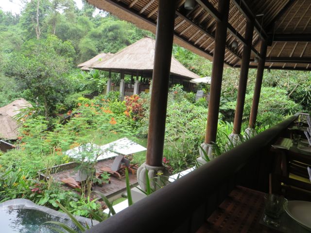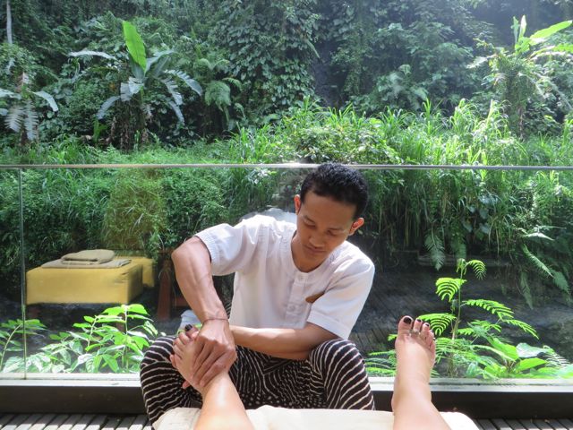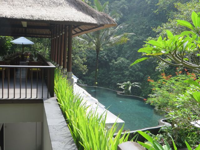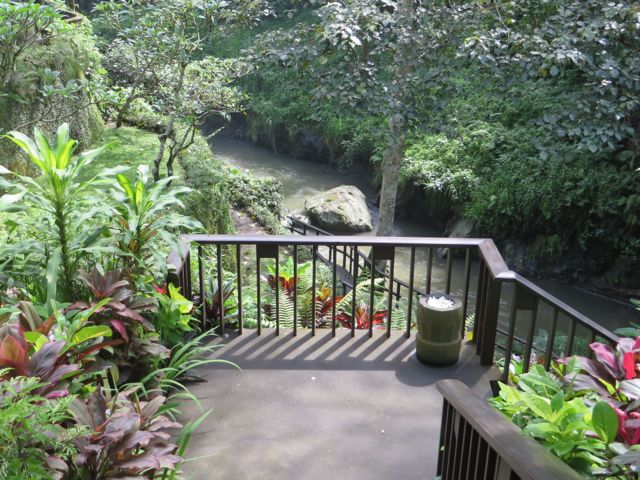 Imagine you are being driven through a marked stone and wood entrance and down a long, quiet road flanked with green grass hills, palm trees, flowers and banyan trees for as far as your eyes can see. In the distance you can see the thatched rooftops of 3 symmetrical buildings and as you come closer, there is a courtyard with a stone path that leads over water to a set of steps up to an open air platform, from which point you gaze through to the other side and see the two facing rows of bungalows with the stone path set into grass that run straight down to the horizon. You are drawn to follow that path, and as you walk, you smell the frangipani flowers and the green of the grass. You hear the birds and the frogs and the sound of water. You see the beautiful modern take on traditional Balinese architecture, using temple-like elements, thatched roofs, wood and stone. And as you walk, you are aware that your horizon line isn’t changing, yet the sound of water is getting louder. The path ends at a balcony. You can go left or right down the steps, or you can look straight over the balcony and down to the Ayung River below, where you will find heaven waiting for you at the spa.