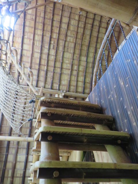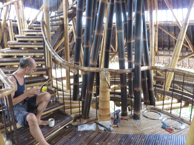 Looking up, Rudiger, a sound architect, artist and musician, is assembling his “strings on bamboo” creation – truly fascinating.