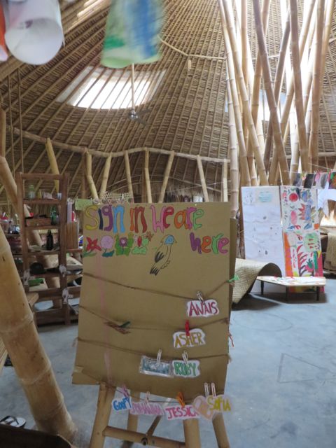 I toured this amazing, evolving creation of the Hardy’s and one thought consistently smacked me on the head. Brilliant. Physically, the structures are inspiring and challenging. For example, the classrooms don’t have walls, so the teachers and students have devised other ways to hang their art and learning surfaces, such as blackboards or whiteboards. Obviously, most of the structures are completely eco-friendly with as little impact on the earth as possible, and that “greenness” translates into everything at this school, from the self-sustaining fruit and vegetable gardens that provide home-grown lunches, to the “solar gardens”, to the community involvement of parents sharing roles as teachers and the involvement of Balinese culture in this extremely international mix of students. Currently, there are 329 students from over 50 countries. The school believes in integrating the local Balinese into this mix and offers scholarships to Bali students in an effort to satisfy its community requirement that 20% of all students are Balinese.