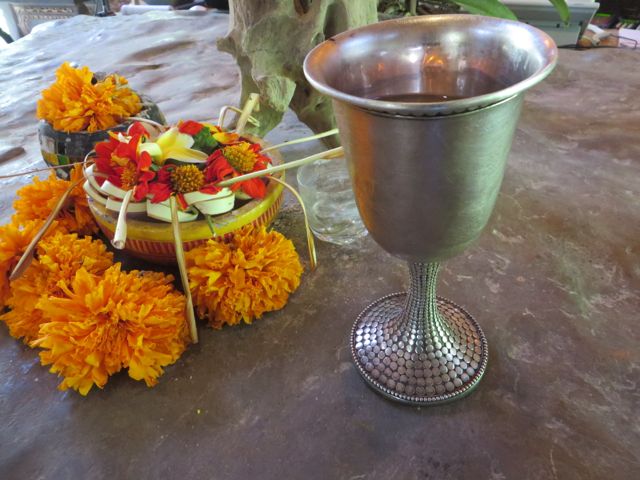 The Balinese people are among the loveliest I’ve ever met. They are soft-spoken, happy, smiling, engaging, and honest!! Because they are Hindu and believe in karma, they do not steal and crime is very low. Actually, this isn’t true all over Bali, but in Ubud, it is very, very safe. Helmuts are left just sitting on motorbikes – nobody would ever steal them. When you bargain for prices or hand over money, there is no worrying that you are getting ripped off. They wouldn’t think of it. They are constantly doing things for good luck, for blessings, and because if they do good things, they truly believe good things will come to them. They believe if they are bad, they or their children will have to pay the price for it. They believe in community, in helping each other. They usually have 4 children, and their names are given based on their birth order, regardless of gender. Putu or Wayan is the first-born. Made (pronounced Mahday) or Kadek is the second born. Nyoman or Komang is the 3rd, and Ketut is the 4th. If they have more than 4 children, the cycle repeats itself. They are also given other names to differentiate themselves but they are usually called by these birth order names. I also learned that each Balinese village has 3 temples dedicated to Brahma; the creator, Vishnu; the preserver, and Siwa; the destroyer. The temples are used for assemblies, dances and performances, meetings, the preparation of offerings, and festivals. I think I spoke about the offerings in a prior post, but this is something that is such a huge ritual in Balinese culture, and what I had first viewed as “messy” because they end up being stepped on, destroyed and torn apart, has now become something of beauty, of being present, and of belief. The Balinese women create these 3×3″ palm leaf baskets in which a daily selection of beautifully julienned local produce and flower petals, usually frangipani, is presented, often 3 times per day, to appease gods and demons that represent the Hindu religion. These offerings are left everywhere – on the streets, at the doors, on the statues, tables, literally everywhere. They are swept up at some point, usually in the early morning, to make a fresh start for the new day’s offerings.