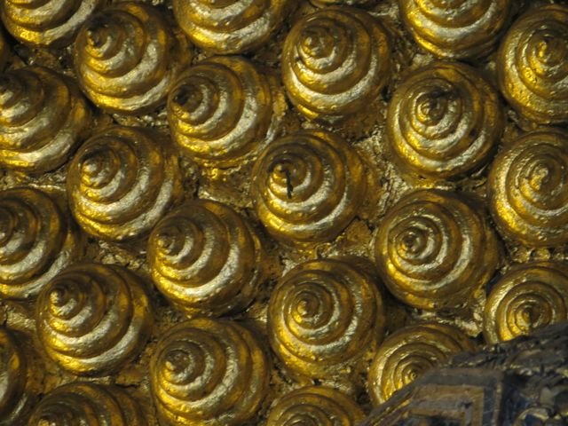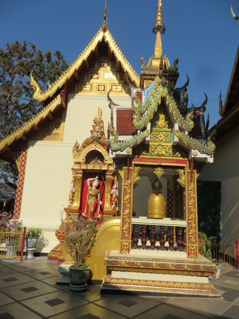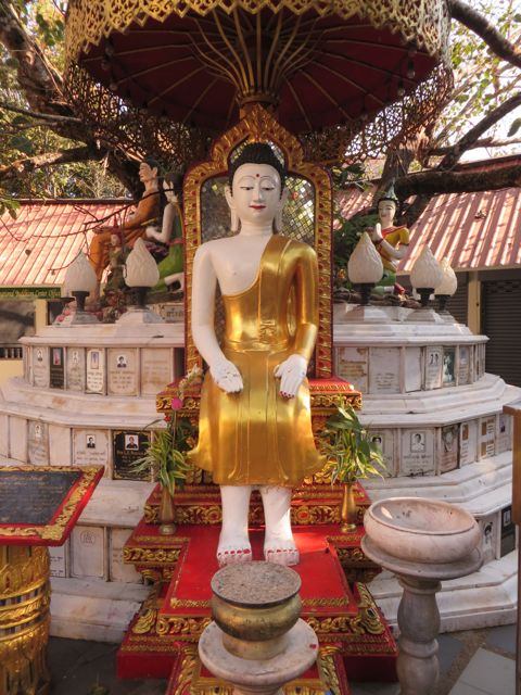 The following day I met a couple of friends for lunch – Gary and Emily, both from Cali but traveling solo – and had my first Pad Thai in Thailand!! I LOVE Pad Thai, and it was dee-fuckin-licious!!! After lunch I took a 6 hour stroll through the shops, through another market, through the temples I had missed the prior day, and just loved everything. I found this one shop that sells crafts and fabric items, like pillows & bed covers, made by the Karen tribe up in the mountains of northern Thailand – beautiful hand work. Found a gallery that had these whimsical nudes done by a Burmese artist that I think I may have posed for. They also have an oil painting that I am dying for…big birthday coming up….ahhhhhh….should I splurge? Still thinking about it. Wait, this whole trip is a splurge. I have no right spending another dime!!! Sigh… I then hit the market just outside the old city walls and got high from the offerings of fabrics and food there…and that just fueled me to keep going. The temples are unreal here – very different from Bali. They are GOLD and ornately decorated, and the Buddhas are…well they’re EVERYWHERE!! Big, small, standing, sitting, sleeping…click, click, click!! It’s like jewelry on display – such intricate work, sparkle and shine. I know I’m posting a ton of pics here, but it’s my blog and I’ll post if I want to, post if I want to, post if I want to.