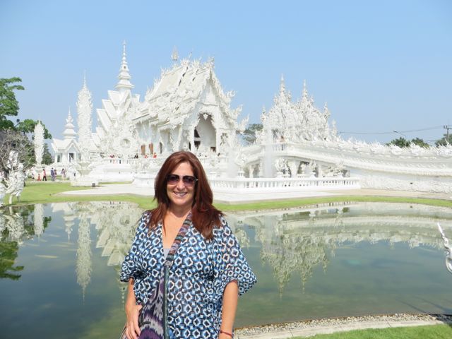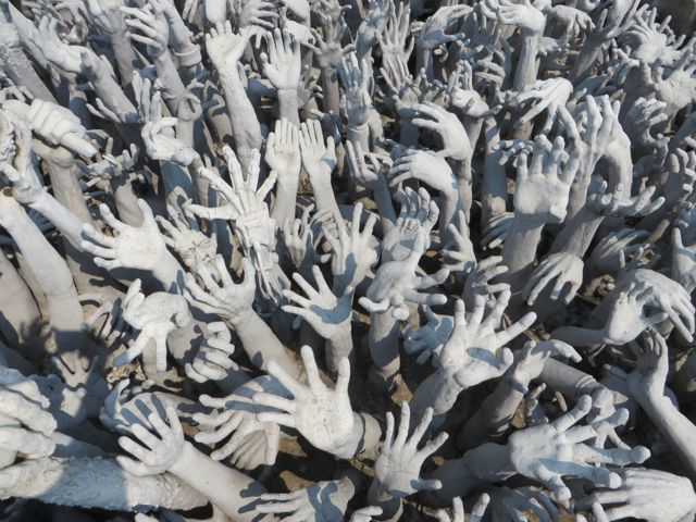 I really wanted to see more of Northern Thailand so I took a day tour – a very LONG day tour (13 hours) – up to Chiang Rai, and to the borders of Laos and Myanmar. The tour van was packed full – I think 14 people – and luckily I ended up next to the sweetest, prettiest girl – Angelique, 25, from Canada – and we chatted for hours. We visited The White Temple, aka Wat Rong Khun. Bizarre!! It was designed by Chalermchai Kositpipat in 1997 as an unconventional Buddhist temple devoted to art and thought. From a distance, it looks like white icing on a very ornate gingerbread house glistening in the sun. But upon closer inspection….what the f..???? It’s more like Revenge of the Living Dead! Hands by the hundreds reach out of the ground, some holding skulls, ALL provoking thoughts of sin, or hell. There are ghoulish heads hanging from trees and monster-like creatures buried waist deep in the dirt. Stone guards beckon you over the bridge toward the temple….toward redemption? I think it’s toward the Gates of Heaven, guarded by the Angel of Death. The bridge rises up and away from the brew of hellish figures beneath it, but once inside the temple you are bombarded with fresh painted murals of the world’s current atrocities, and pop culture icons. I suppose it’s an apocalyptic end of world with our current demons and heroes – begs the question of who will save us…The twin towers are depicted with a plane crashing into it, George Bush (let me be clear – atrocity), Michael Jackson, The Matrix, Avatar, even Spiderman. It’s CRAY-ZEE!! No pictures were allowed to be taken inside the temple – believe me, I would have, but didn’t want to end up in the mural. Oh, one last thing – the only part of this entire mass of buildings that is NOT white is the GOLDEN TOILETS – only the outside is gold, the interior is more like a really bad port-o-potty/hole in the ground/watch-where-you-step experience.