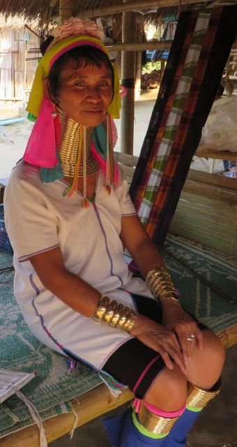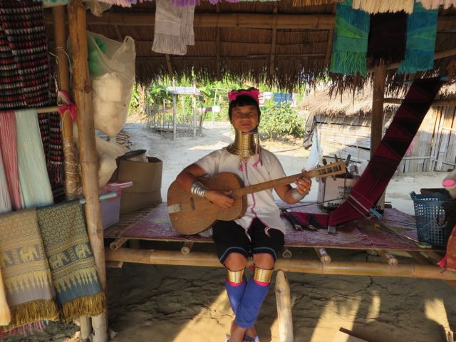 We then went up to visit the Long-necked Karen and Akha Tribes. About 150 years ago, these tribal people migrated from China down to Thailand, Burma, Laos, and Vietnam. This particular tribe is originally from Burma but fled during the civil war and sought refuge in the northern hills of Thailand. The Thai gov’t allows them to stay on this piece of land and farm it, but they are not allowed to leave it and have no rights as Thai citizens. They live in villages way up in the hills where they farm and weave fabrics and make scarves and hats and crafts to sell to tourists. But the most interesting thing about them is that the women wear these solid brass rings around their necks, an old custom that was created to prevent tigers from killing them. They begin at age 5 and add one per year until they have 37 rings. Then they are considered to have the perfect amount of rings. They never take them off, except once a year when they are being added to. They die wearing them and are buried with them. These rings are HEAVY. At least 10-15 lbs. It appears that the rings lengthens their necks, but it’s the weight of these rings that presses down on their shoulders so that their clavicles appear to be part of their necks. The threat of tigers doesn’t exist anymore, but the culture and traditions do. And tourism probably drives this as well.