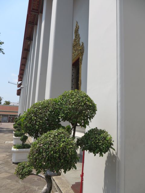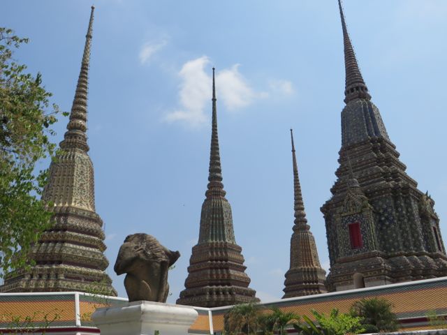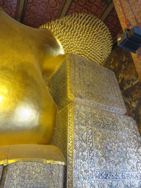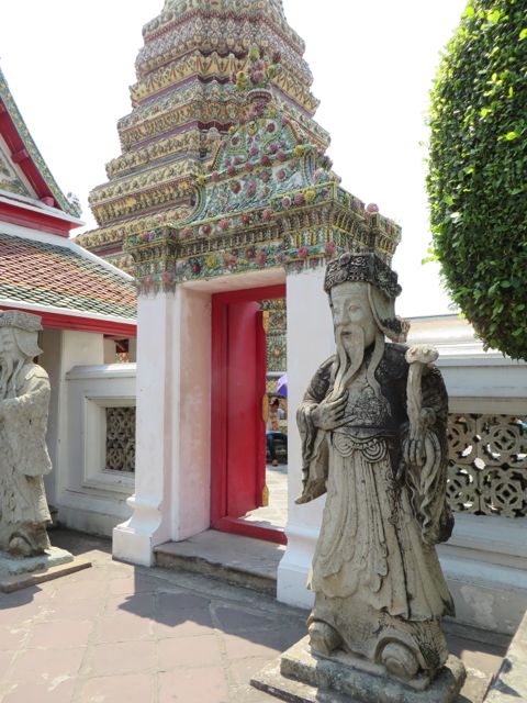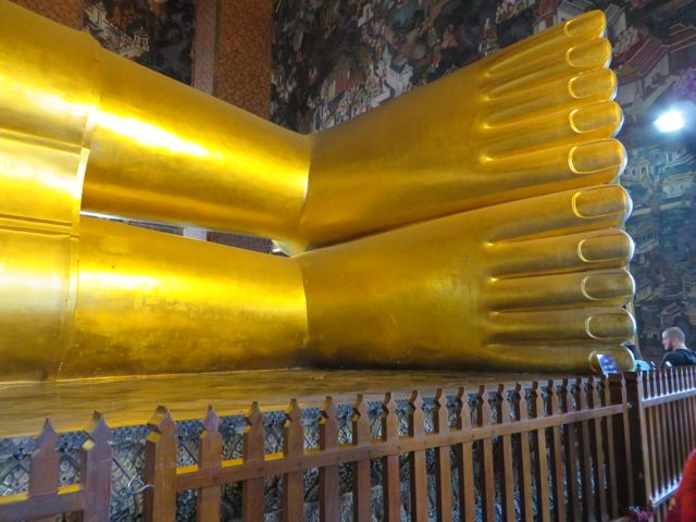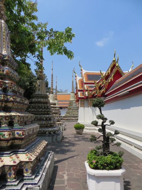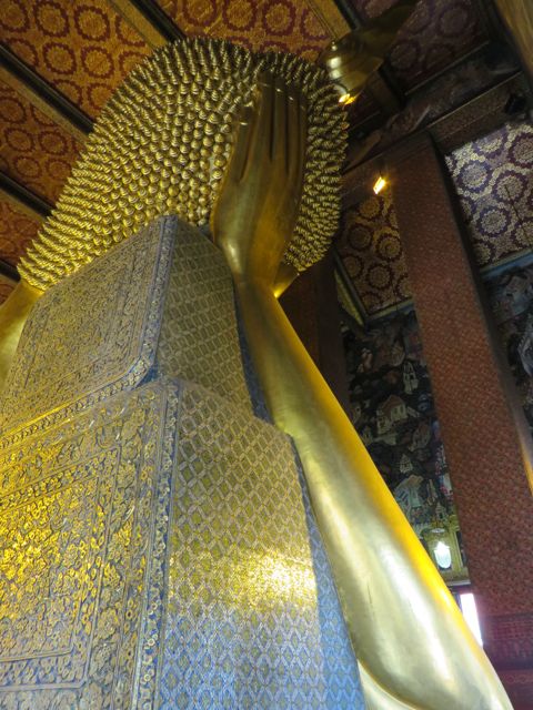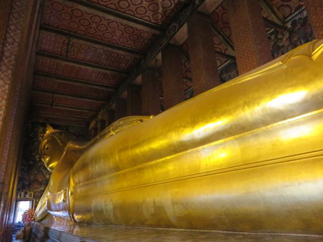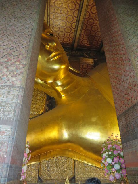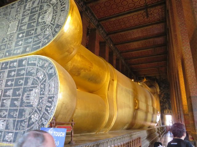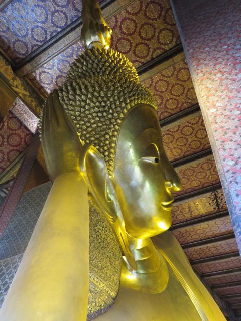 There are so many temples, of course, but the big highlight for me was Wat Pho. Oh – I did get scammed once here – not so bad though. There are guys who are taxi drivers who stand at some of these sights and “help” you get your bearings, show you where to go…but they will tell you that the sight you wanna see is closed until…well, if it’s 11:00 it’s closed till 2:30 so that he can take you around to see x,y, and z and then drop you back off here just in time for the opening. I had wanted to first go to the Grand Palace, and I was standing within earshot of an American family getting the schpiel being told it was closed until 2:30, although I did not know it was a schpiel at the time, and when I chimed in to inform them that I believed Wat Po was open and it was just next door, the cab driver nodded yes, and lost his “almost victims” because he thought I knew what I was talking about. I didn’t, but he confirmed it was open so we all walked over to Wat Pho. I waited till 2:30 to walk back over to the Grand Palace, and as I walked along the white wall, I listened to the speaker system loudly telling me and every other visitor, that the Palace is open everyday from 8 until 6, and if anyone tries to tell me otherwise, please do not believe them. I laughed. At least I didn’t lose any money.
