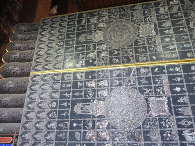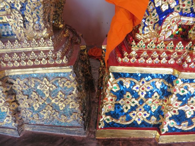 Wat Pho is known as the Temple of the Reclining Buddha, and houses the most enormous Buddha in Thailand at 160 ft. It is also the home of the original Thai massage school, and a working monastery with monks in residence and a school for them. There are numerous chedis which contain the ashes of the royal family. The Buddha is covered in gold leaf supported by a base made of glass mosaic. His feet are inlaid with mother of pearl displaying symbols of identification for Buddhas. It is breathtaking. I stayed a long time just admiring him. Even the detail on the ceiling and walls of the structure that houses the Buddha was fascinating. Real artistry. The entire complex is jaw-dropping. I could’ve stayed all day, really. And I’m sure you will flip through these pics rather quickly, but for me, when I look at them, I remember turning each corner and just being wowed.