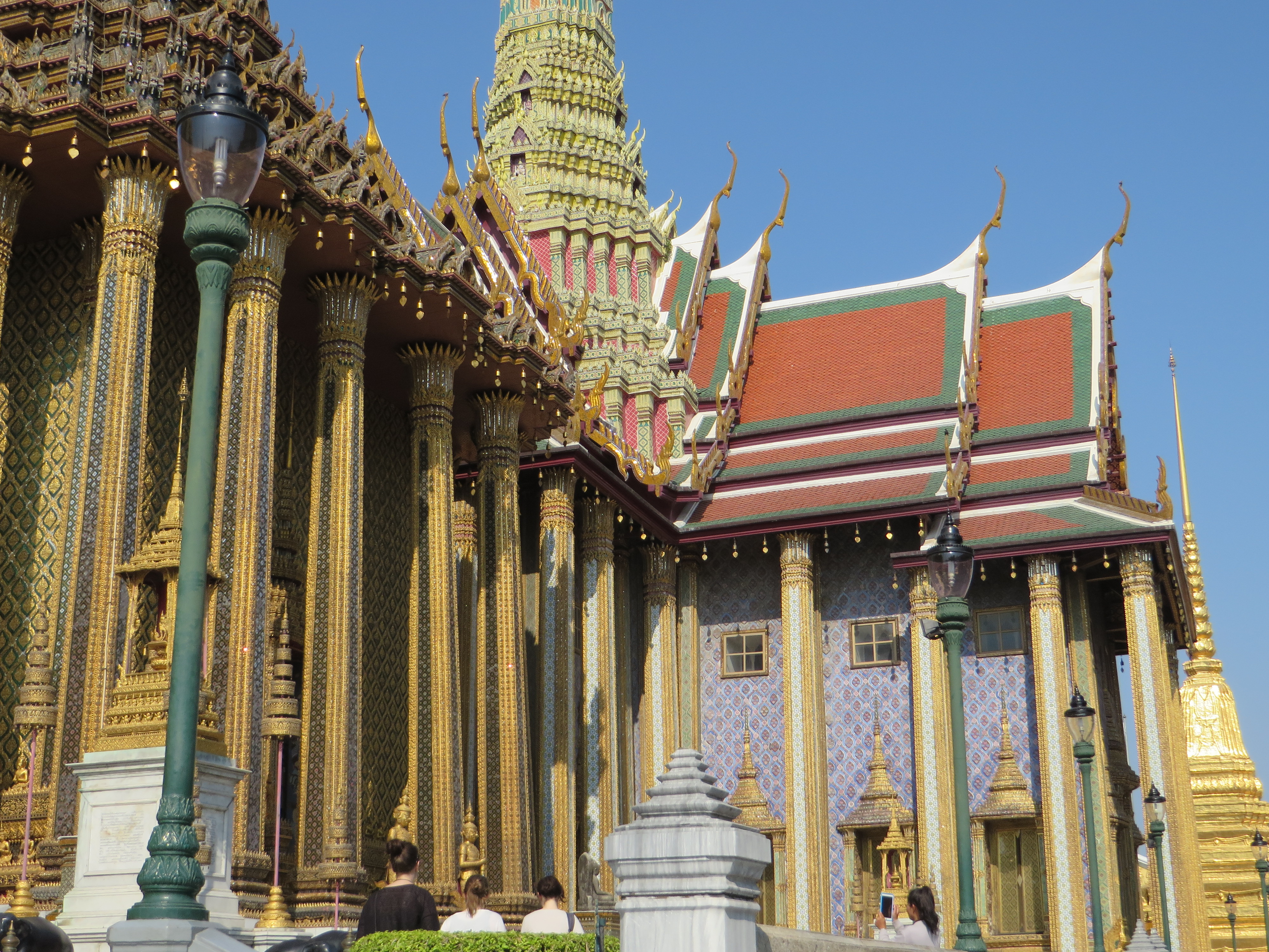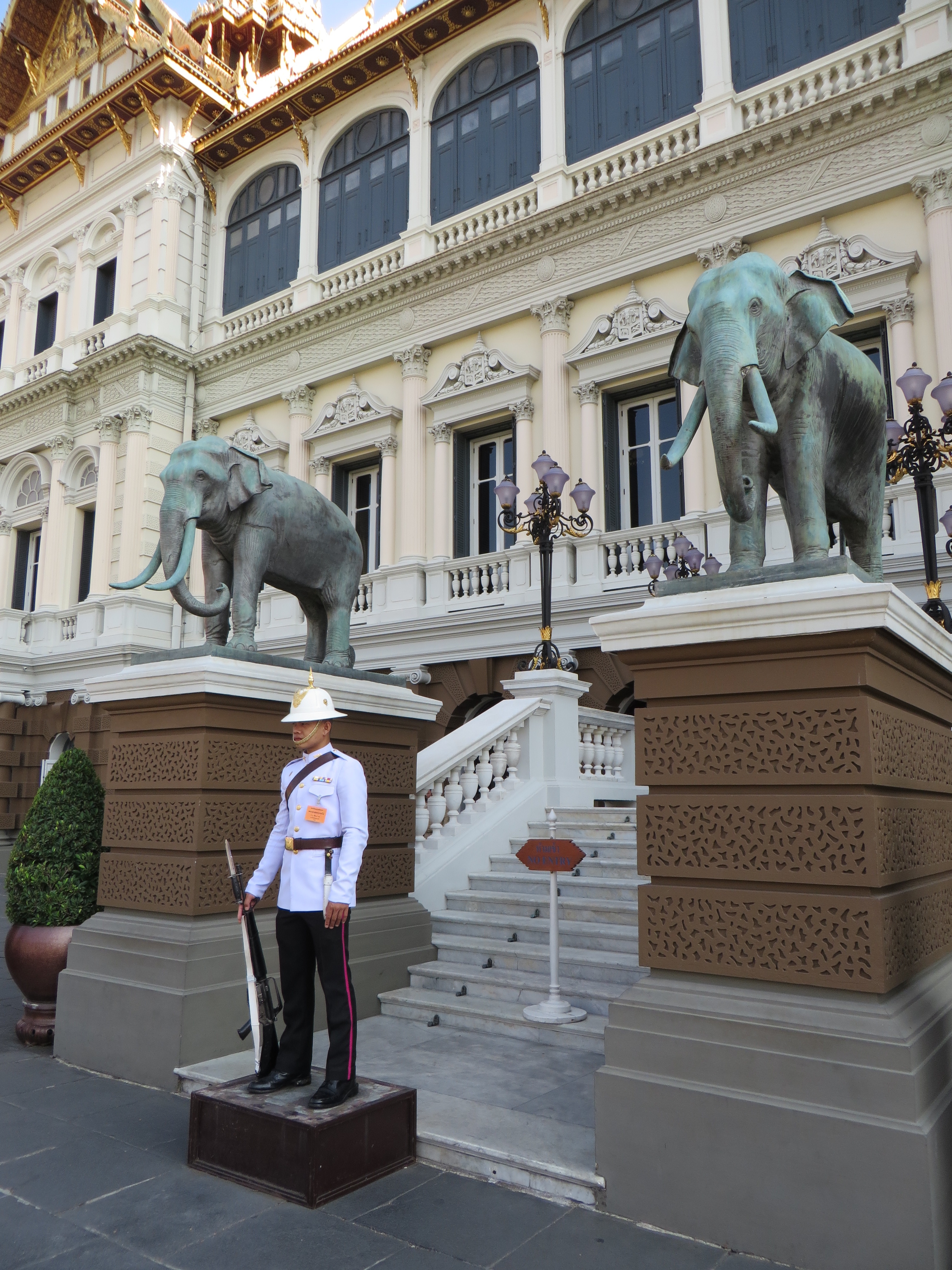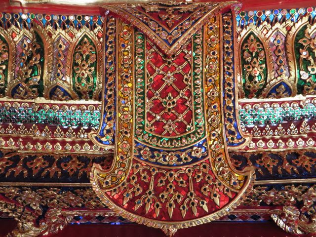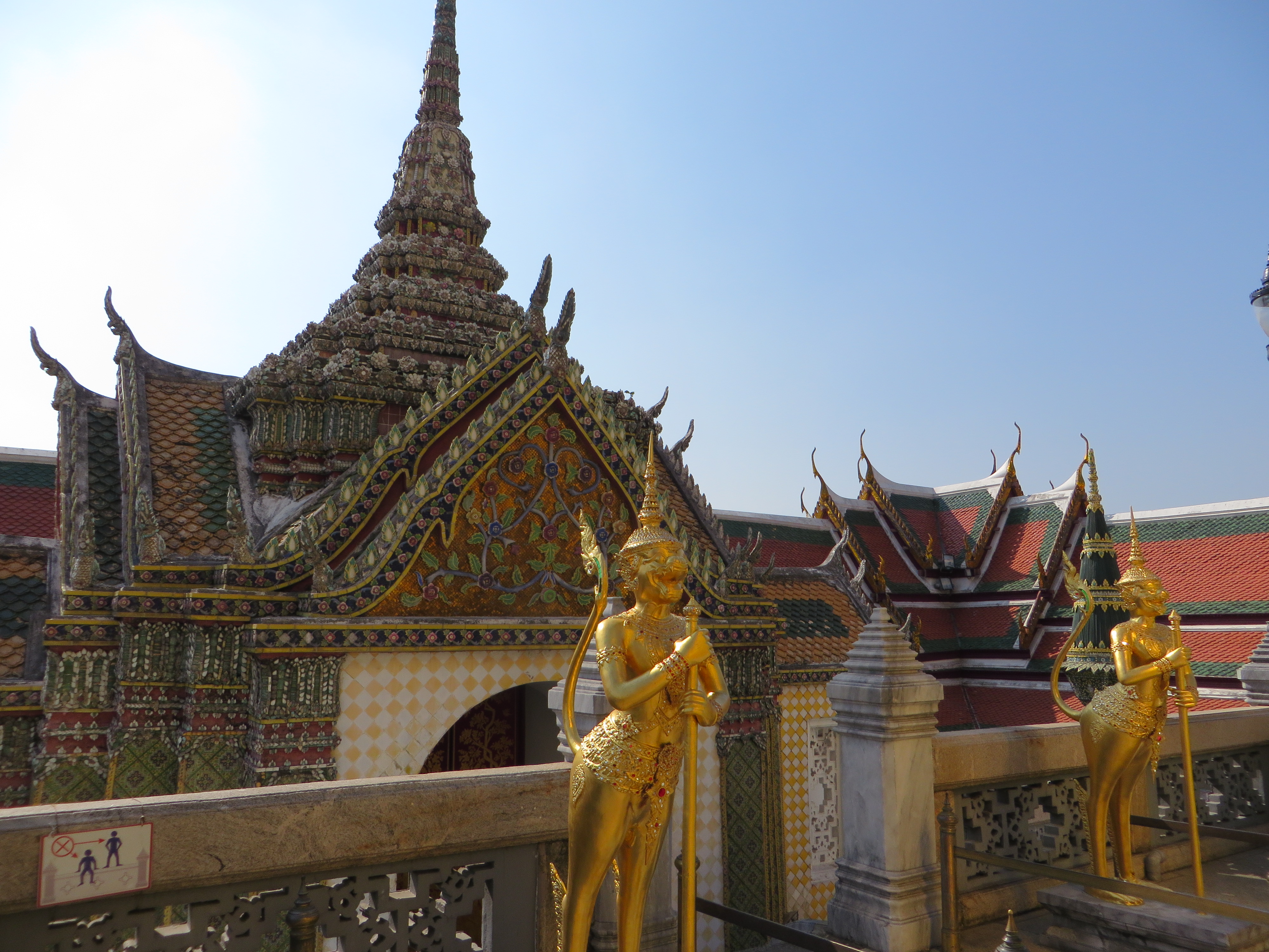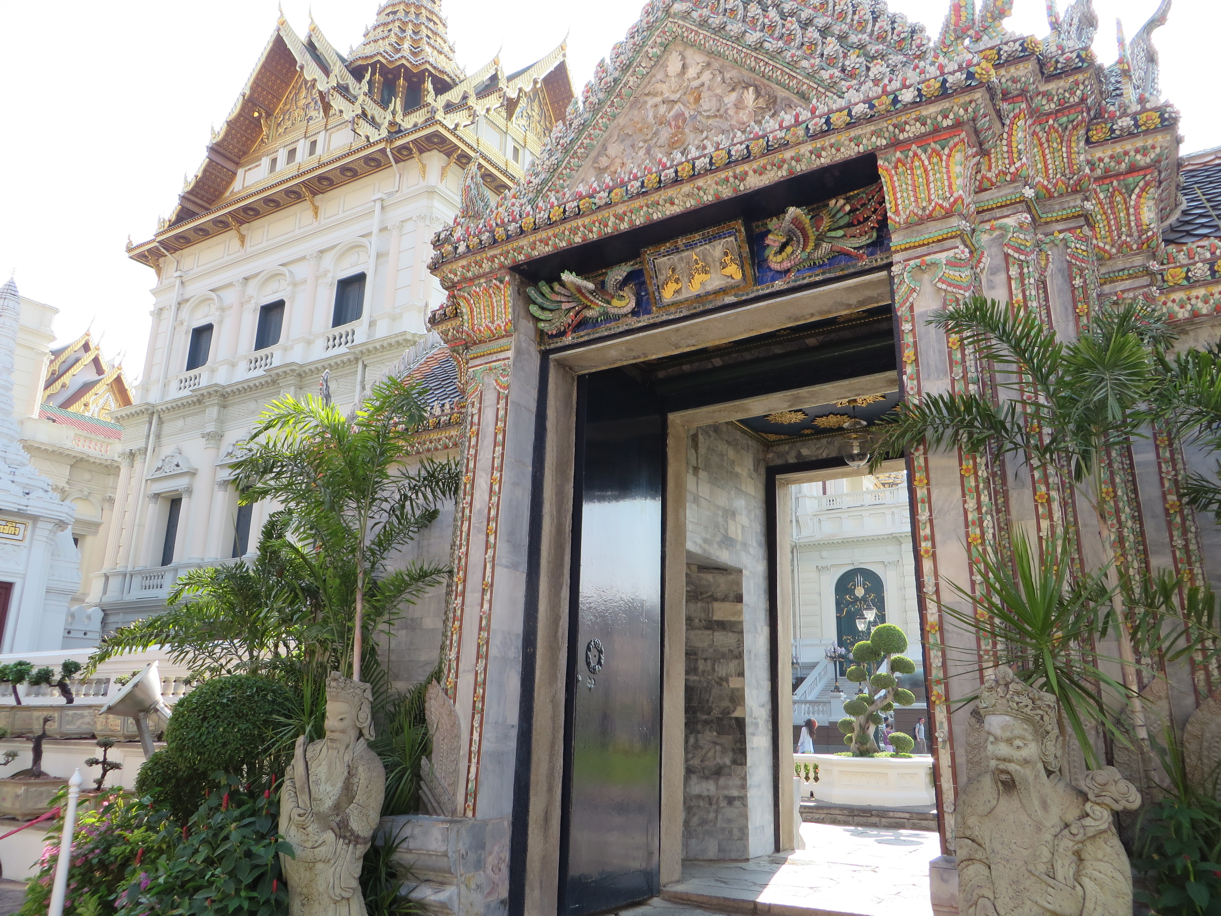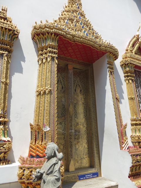 Have you had your fill of temples yet? Not so fast – one more sight to see – the Grand Palace, which is where the royal family lives and the throne halls, and also where some gov’t offices are, and the Temple of the Emerald Buddha. Pretty impressive. Built in 1782 by King Rama I, it is a HUGE square block, but not a normal block, more like 55 acres (really, 55) surrounded on all 4 sides by a white wall. Each side is over 1/4 mile long. Shiny gold and glass mosaics…