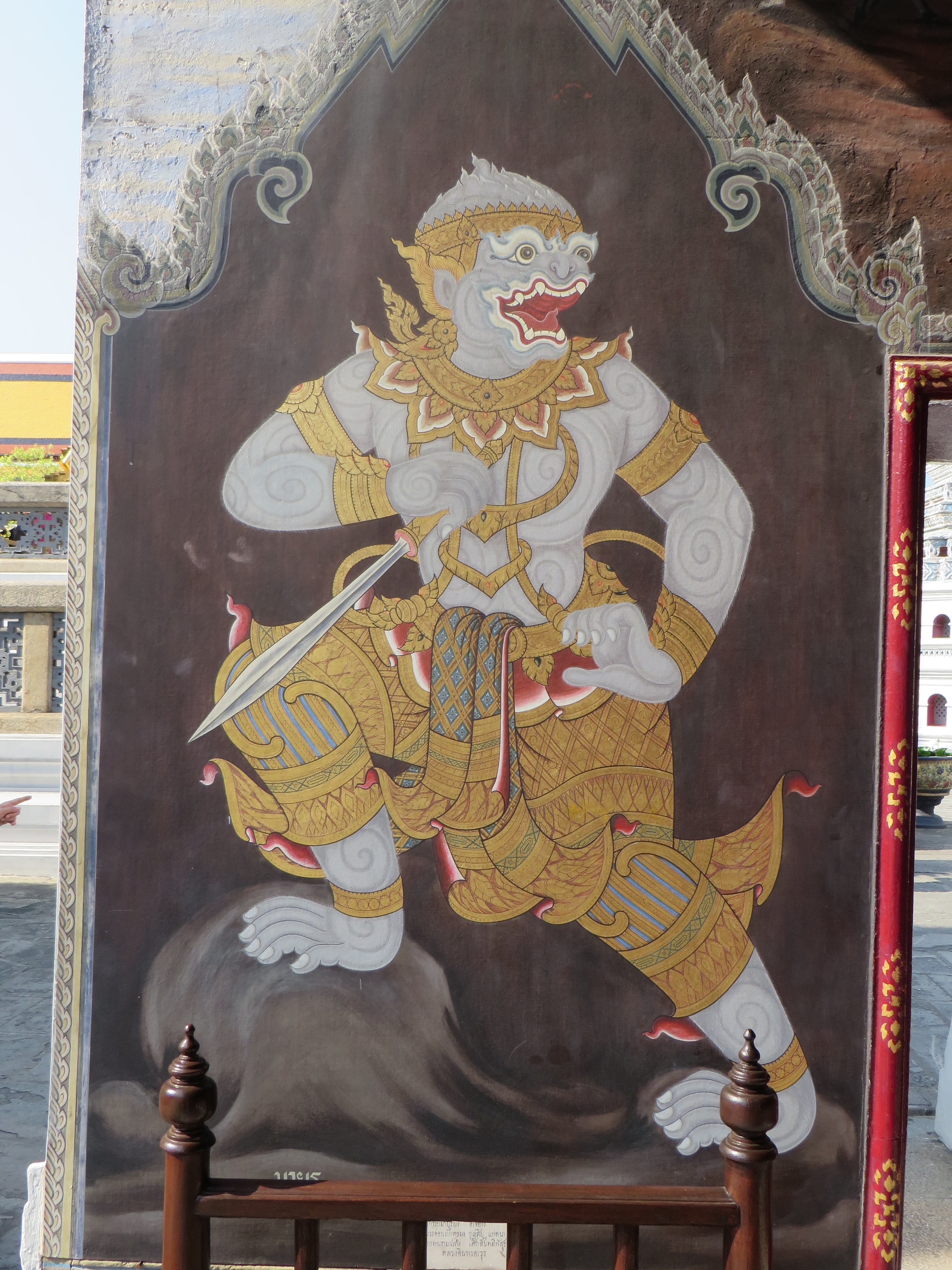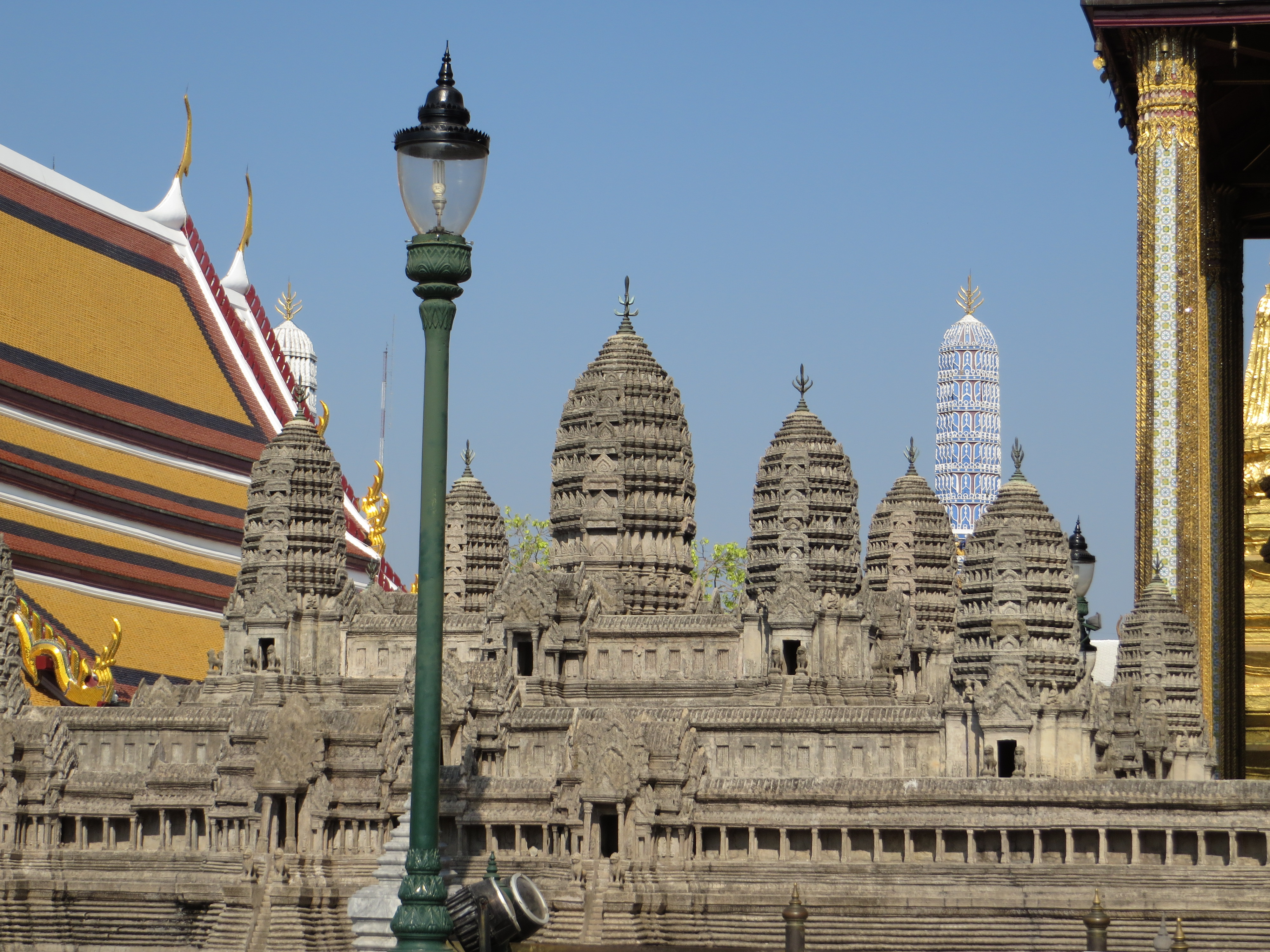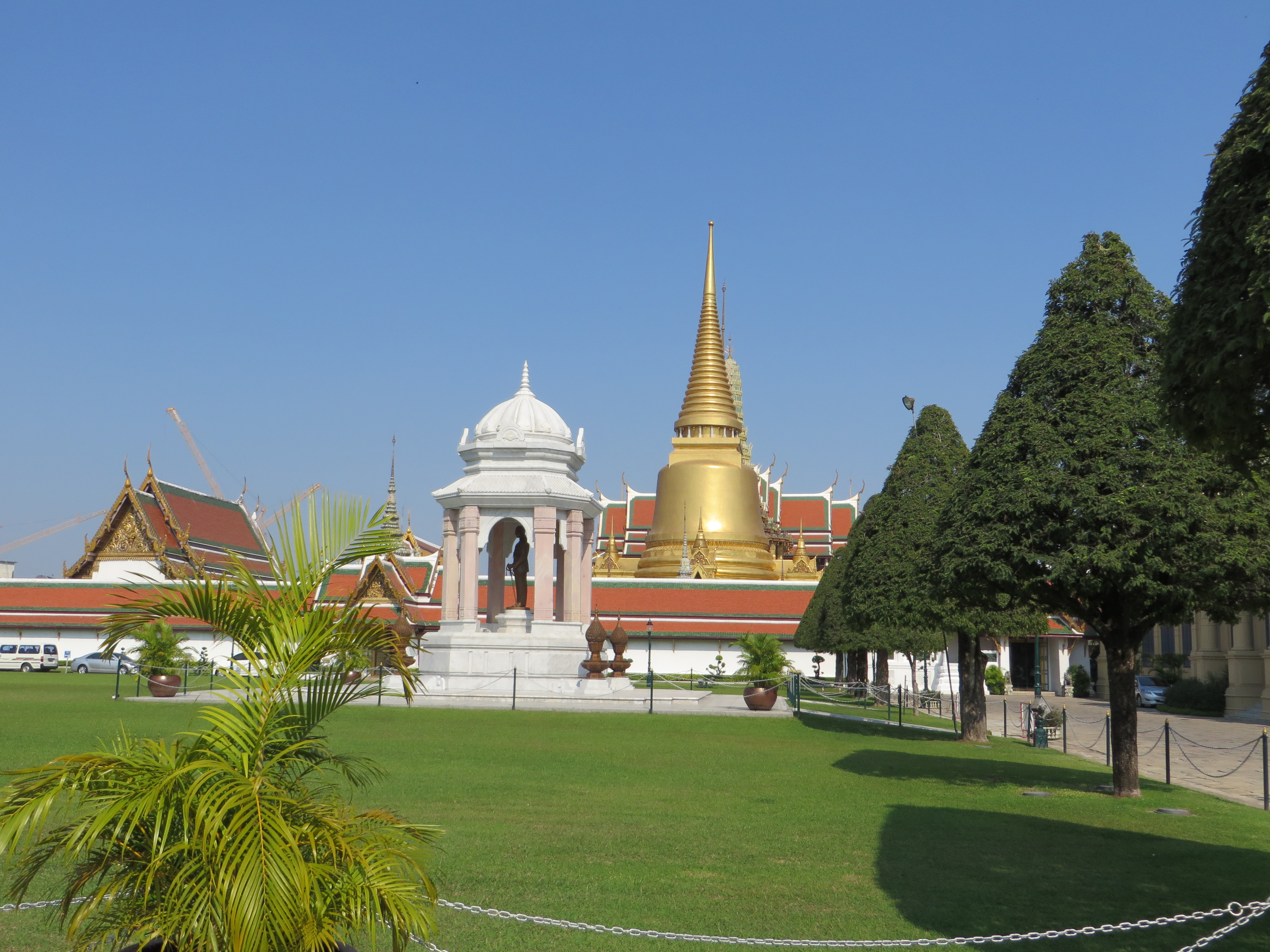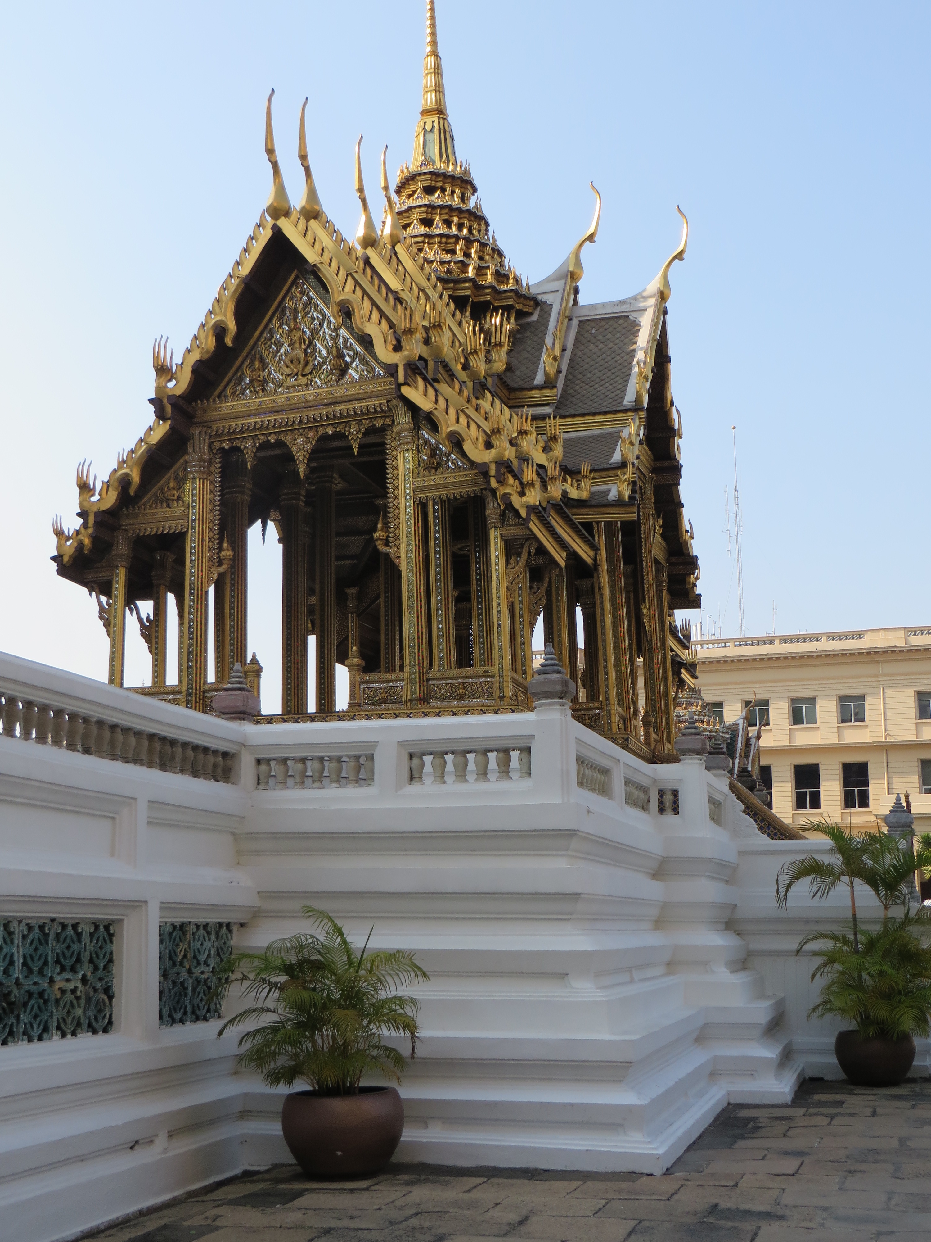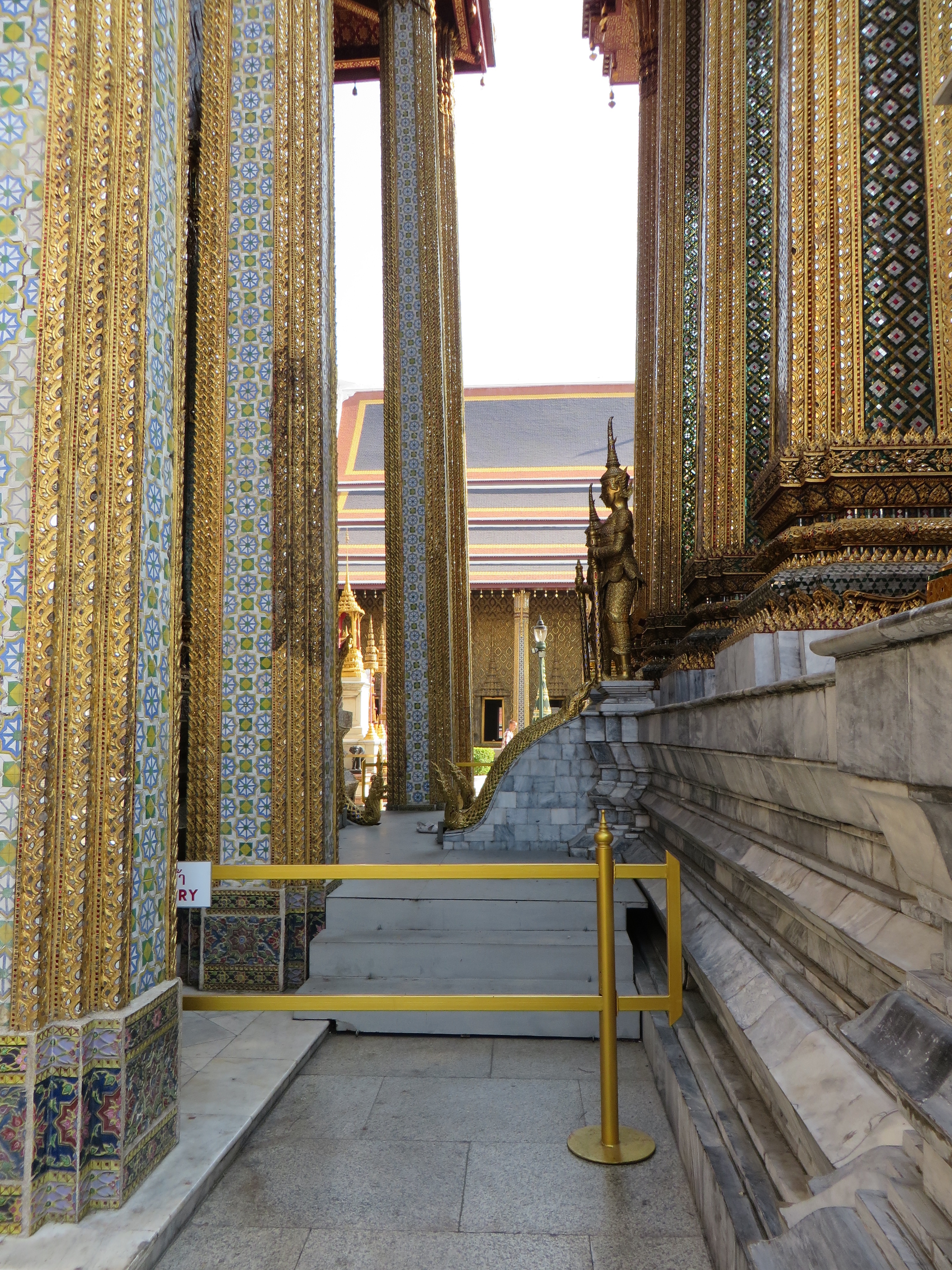 Have you had your fill of temples yet? Not so fast – one more sight to see – the Grand Palace, which is where the royal family lives and the throne halls, and also where some gov’t offices are, and the Temple of the Emerald Buddha. Pretty impressive. Built in 1782 by King Rama I, it is a HUGE square block, but not a normal block, more like 55 acres (really, 55) surrounded on all 4 sides by a white wall. Each side is over 1/4 mile long. Shiny gold and glass mosaics…